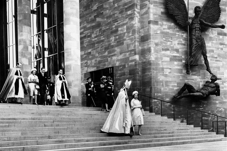 Pictured in 1962, six years after laying the new cathedral’s foundation stone, Queen Elizabeth II is seen here leaving the consecration service alongside the Bishop of Coventry. Incorporating the ruins into a modern aesthetic, Sir Basil Spence’s design is considered a Brutalist masterpiece.