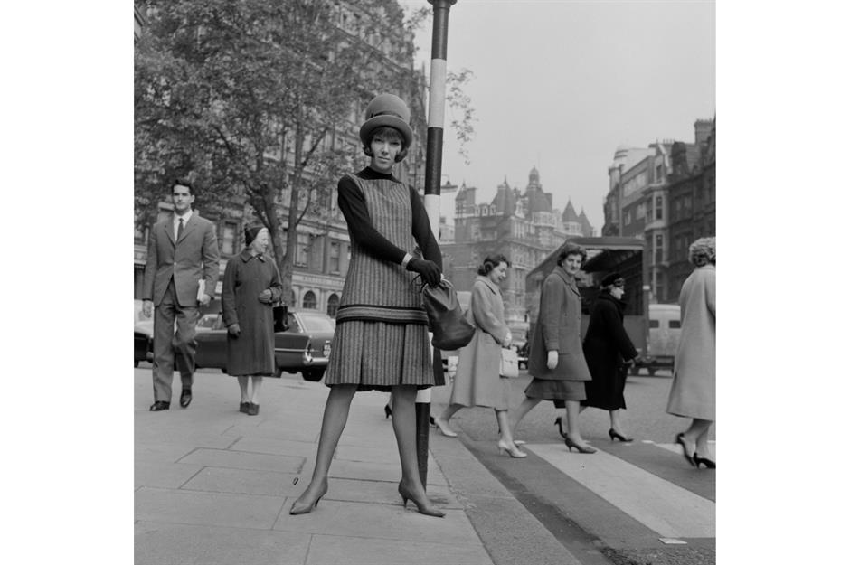 Seen here, wearing a striking hat and turning heads, Mary Quant towered over British fashion in the 1960s. This photo of the influential and subversive icon was taken near her shop Bazaar in Knightsbridge, London. Known for her work democratising fashion, the self-taught designer brought stylish clothes to the masses.