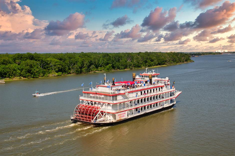 The Georgia Queen is a towering paddle-wheel riverboat cruising Savannah’s historic waterfront. Measuring 230 feet (70m) long and six storeys high, it evokes classic steamboat grandeur and features three ballrooms, vintage chandeliers and a sweeping staircase. Though built in the 1990s, it channels 19th-century riverboat style and honours Savannah’s steamship legacy, as well as its Southern charm.