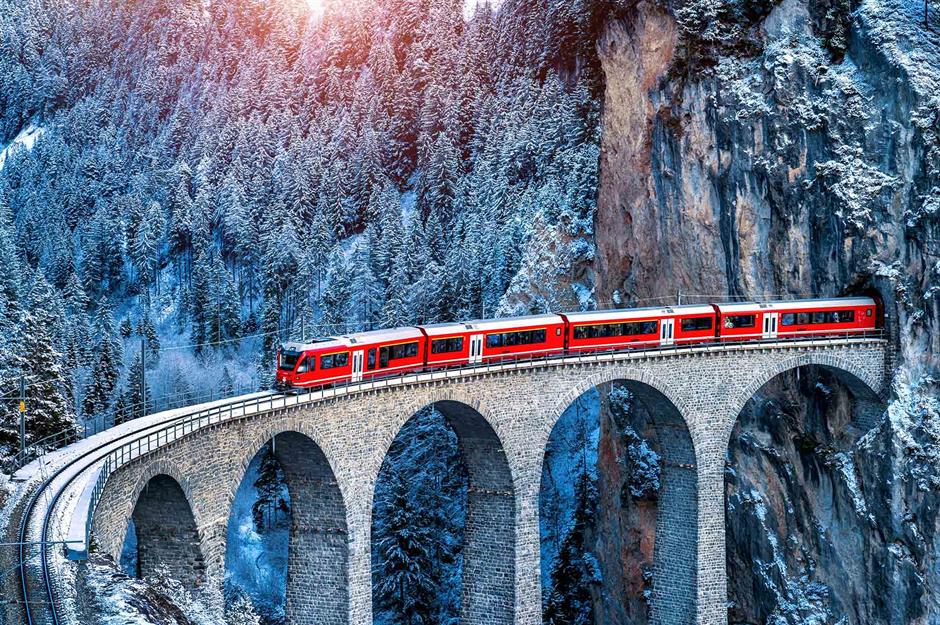 Switzerland’s Glacier Express, launched in 1930, links the chic ski resorts of Zermatt and St. Moritz via a breathtaking eight-hour alpine journey. Dubbed the world’s slowest express train, it crosses 291 bridges and 91 tunnels, including the iconic Landwasser Viaduct (pictured).