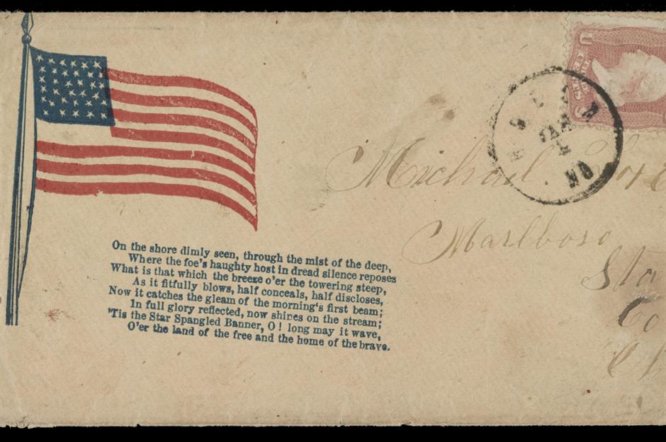 Pictured is a Civil War-era envelope bearing the flag and the poem’s second stanza.