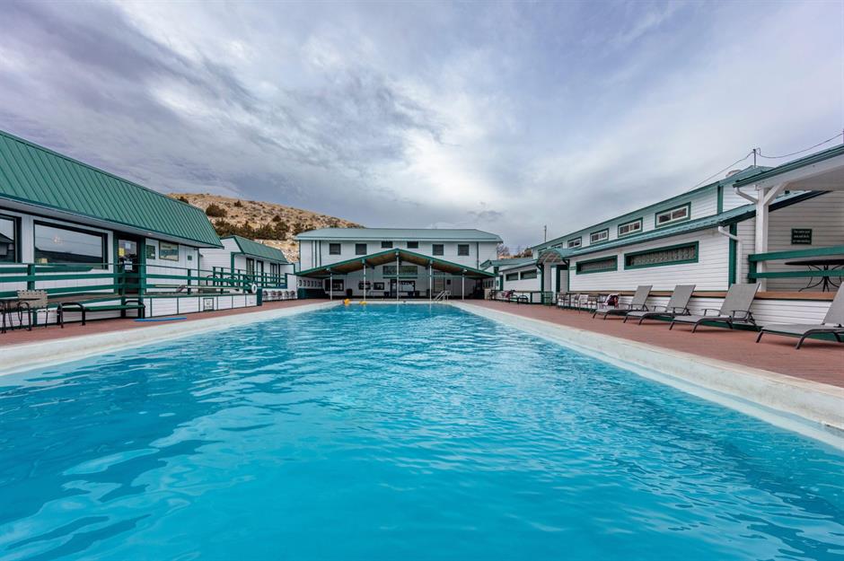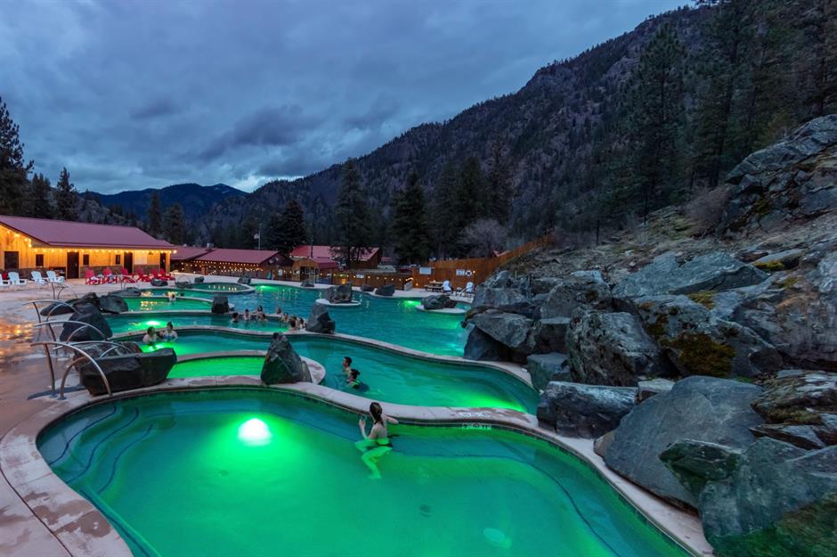 Set beside the Clark Fork River, Quinn’s combines mountain scenery with comfortable facilities. Five mineral pools range from 100°F to 106°F, with river and canyon views. A lodge, cabins, a saloon, and a restaurant form part of the complex, and overnight guests can access pools from early morning to late evening.