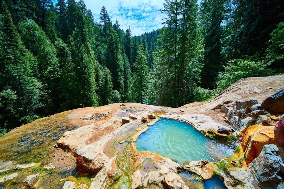 Perched above the North Umpqua River in the Cascade Range, this is one of the most scenic hot springs in the country. A short but steep walk leads to a series of travertine pools, each slightly cooler as they cascade down the hill.