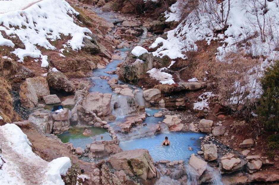 Wooden shelters protect some pools from rain and snow, and the raised view of the river below adds to the tranquillity. A small day-use fee applies, facilities are minimal, and the road can be inaccessible in heavy snow. Best visited early morning or off-season for quieter soaking.