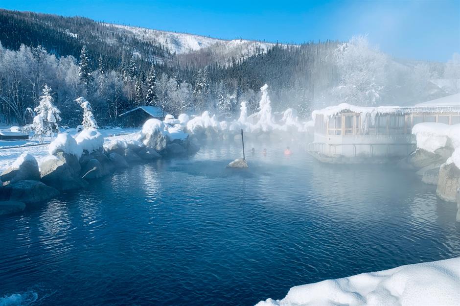 About 60 miles from Fairbanks, Chena offers the surreal pleasure of soaking in steaming water while snow surrounds the rocky pool edges. The outdoor lake-like pool is open year-round, even in temperatures below -22°F.
