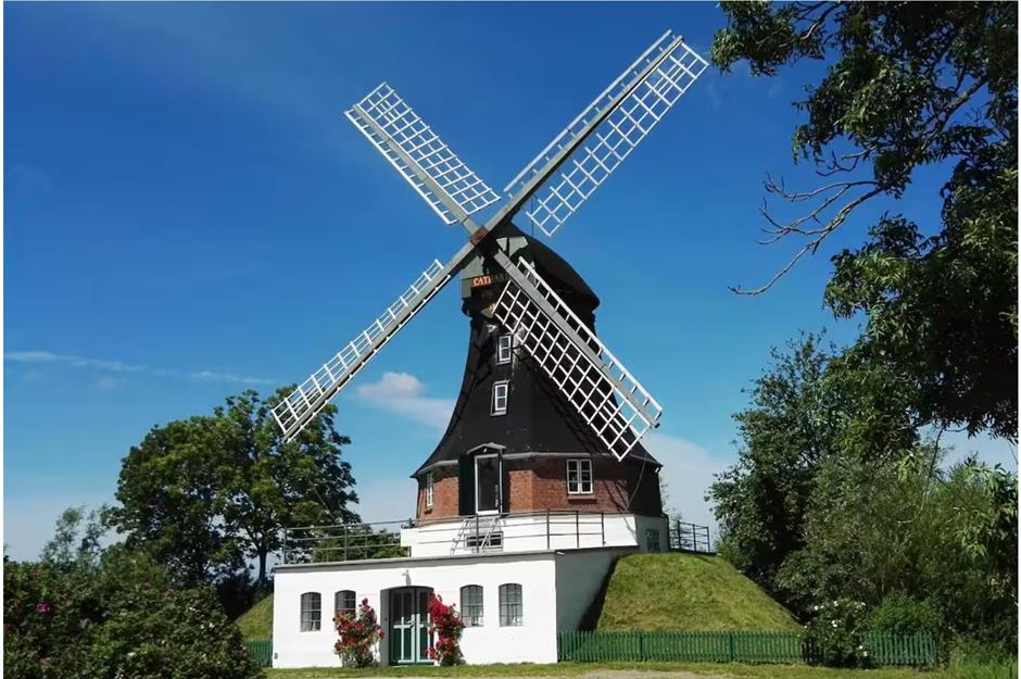 Rising above the flat, windswept landscapes of the Eiderstedt peninsula, Windmill Catharina offers the chance to stay inside a fully restored historic mill a short drive from the North Sea. The circular rooms span multiple floors, with exposed timber, curved walls and sweeping 360-degree views over pastureland and big northern skies.