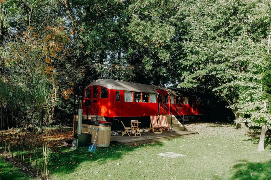 A treat for lovers of quirky design, this fully converted 1938 London Underground tube carriage sits on a peaceful, adults-only glamping site near Lavenham in Suffolk. The one-bedroom carriage keeps its original character while offering modern comforts including under-floor heating, a well-equipped kitchenette and large countryside-facing windows.