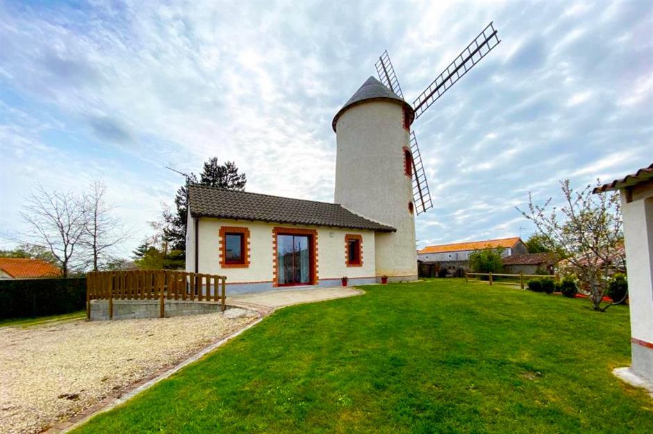 In the heart of the Pays de la Loire region, this former 1833 windmill, renovated in 2018, stands tall with granite-stone stairs, original beams and panoramic views over the surrounding countryside.