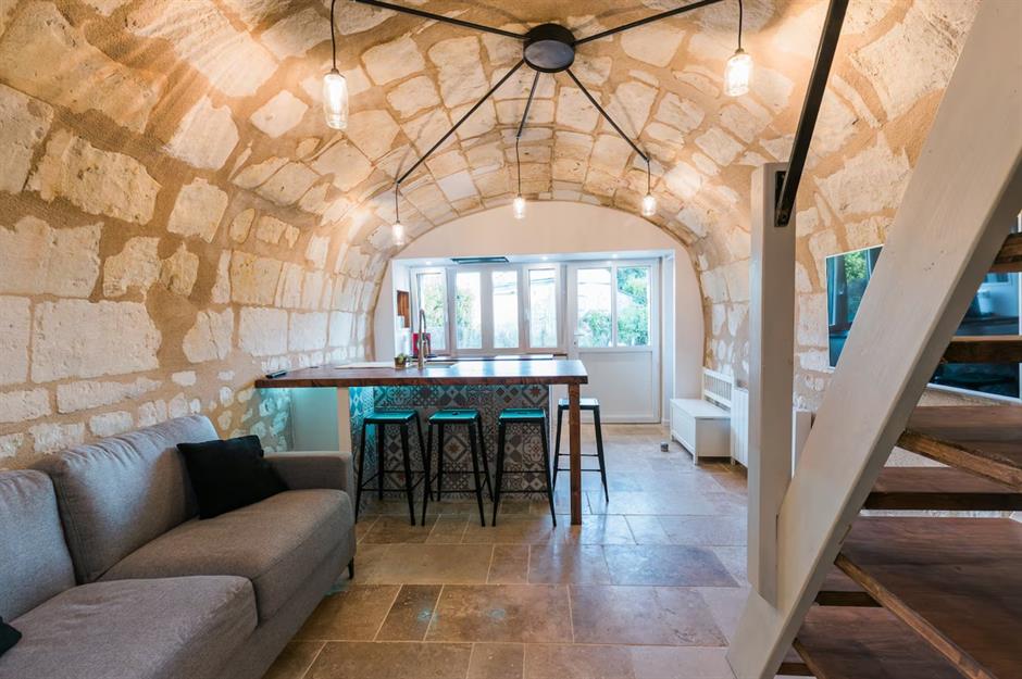 Perched above the medieval town of Chinon in France's Loire Valley, this restored walnut-oil mill combines thick stone walls, timber beams and compact rustic charm with a well-equipped modern interior.