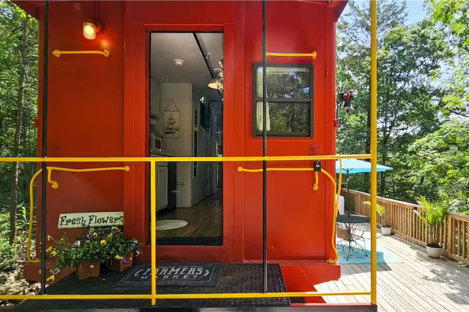 Set just outside Eureka Springs, this converted caboose offers a quiet woodland setting with easy access to the town’s restaurants, shops and Victorian-era streets. Inside, it includes a queen bed, compact kitchenette, heating and air-conditioning, plus a small dining space and TV.