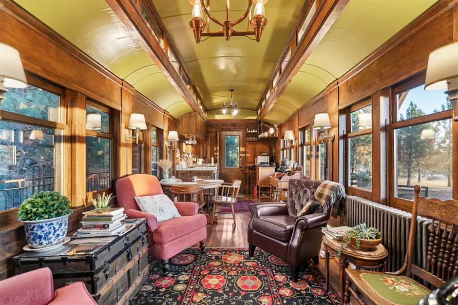 Tucked into 145 acres of wheat fields and forest in rural Idaho, this restored 1909 railcar offers a stay with real frontier character. The carriage still carries its early-20th-century bones – warm timber panelling, narrow proportions, little quirks of layout – but it’s been reimagined as a comfortable hideaway with a full kitchen, bathroom and relaxed living space.