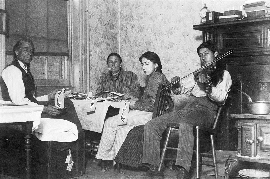 The 19th century saw the construction of New York’s first tenement blocks, which contained cramped, single-room accommodation that housed many of the city’s poorest residents. This 1895 photograph shows a Native American man known as Mountain Eagle making traditional crafts with his family, while his son plays the violin in their small tenement room.