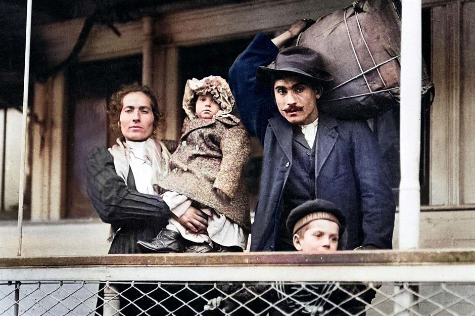 This incredible colorized image from 1905 shows an Italian immigrant family of four departing Ellis Island on its dedicated ferry, likely bound for its terminus in Lower Manhattan after being granted entry to America.