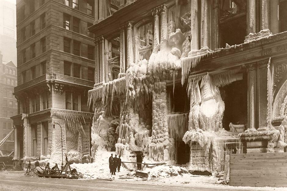 Pictured here is the dramatic end of an early architectural icon of New York: the Equitable Life Assurance Society Building. Completed in 1870 as the company’s headquarters, the tower was gutted by a fire on January 9, 1912. As firefighters worked to contain the blaze, water from their hoses froze in the winter air, creating the eerie, ice-encrusted façade seen here.
