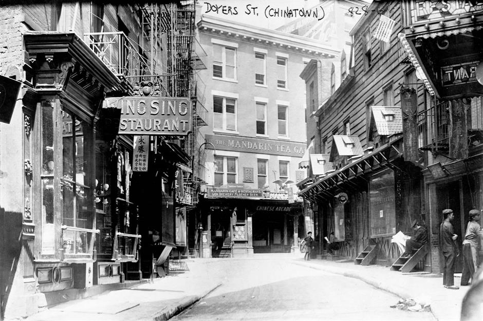 Early establishments were primarily tea houses and rice shops serving Chinese New Yorkers, but by the 1880s, the area had expanded to include restaurants, curio shops, laundries, and department stores. This image of Doyers Street taken in 1890 shows it lined with eateries, cafés, and an arcade.