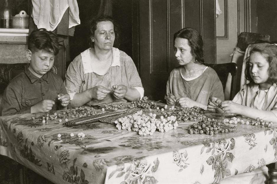 Pictured in 1924, a mother and her children sit around the kitchen table of their modest tenement home, stringing together what appear to be artificial flowers. A 1913 survey of New York’s artificial-flower industry found that more than half of all production took place in tenement apartments just like this one.