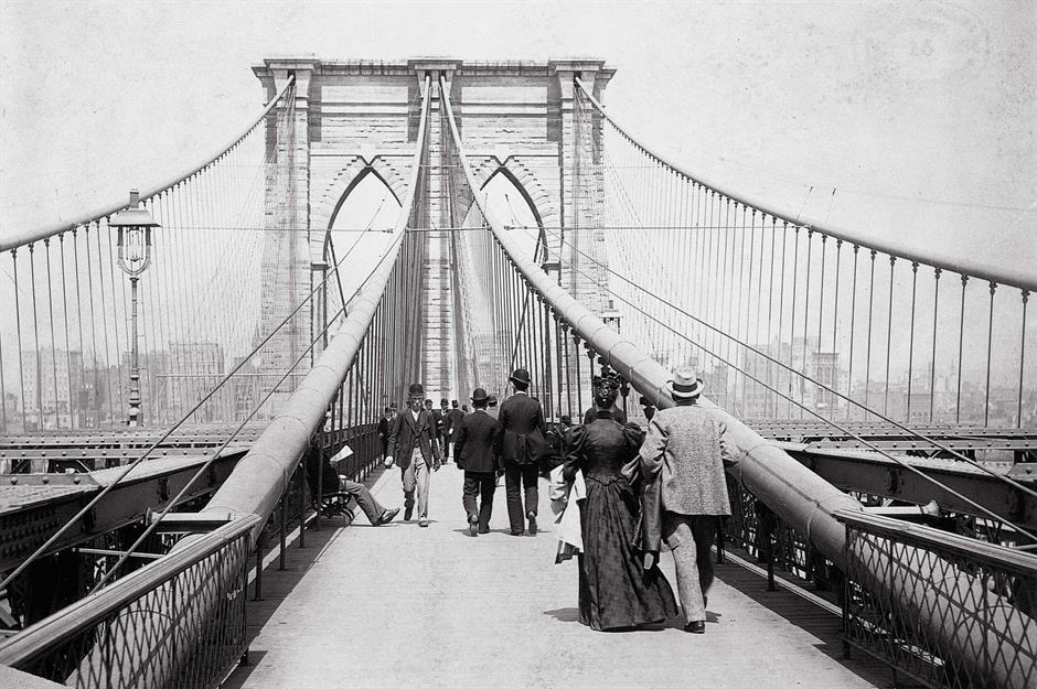 This 1894 photo shows New Yorkers strolling along the bridge's pedestrian walkway as the skyline of the city rises around them. On either side, the bridge’s distinctive cables are visible, created using a unique wire-weaving method devised by Roebling himself.