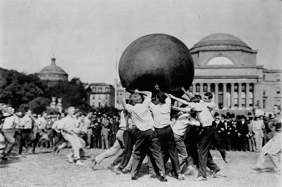 Founded back in 1754, Columbia University is New York's oldest institution for higher education and a defining city landmark. But campus life looked pretty different in the early 20th century. In this 1910 photograph, taken in front of the Low Memorial Library, students play pushball – a comically oversized version of soccer.