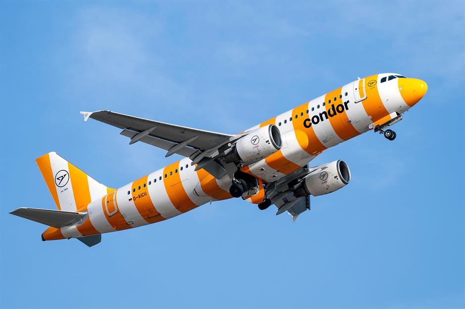 Condor’s striped livery is one of the boldest and most distinctive designs in the skies today. Introduced in 2022, the look features broad vertical stripes in shades like sky blue, sunshine yellow, forest green and coral red.