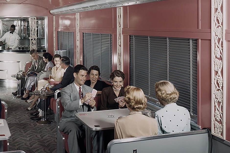 Here, travellers are seen passing the time in one of the two lounge cars in the 1950s.