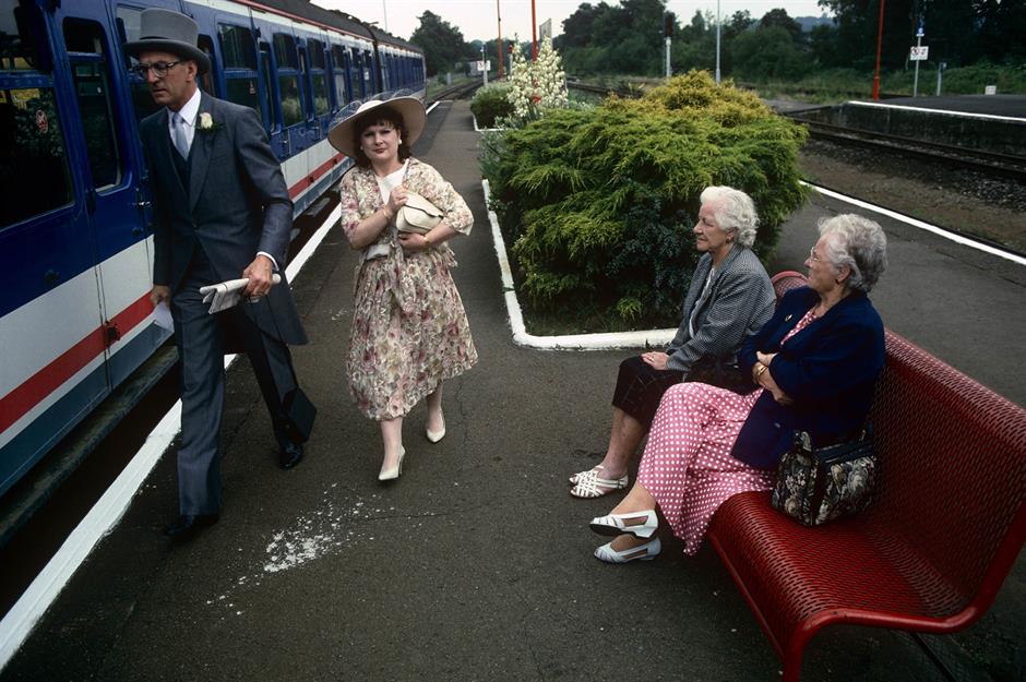 Here, captured in June 1993, a couple in their finery arrive at Ascot station in Berkshire from London Waterloo for Royal Ascot racing week, while two women watch on.